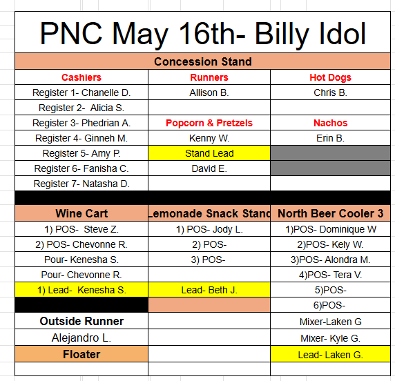 - From Lot F walk to the left towards Lot E. Walk down the steps and turn right. Walk straight across the street and follow the gravel lot to check in. Sign in on the CDYC clipboard and grab a red Live Nation shirt. Enter the gate and take the first left after the concession stand on your left and walk all the way to the north gate side. You will be directly in front of stand 1 which is the CDYC concession stand.