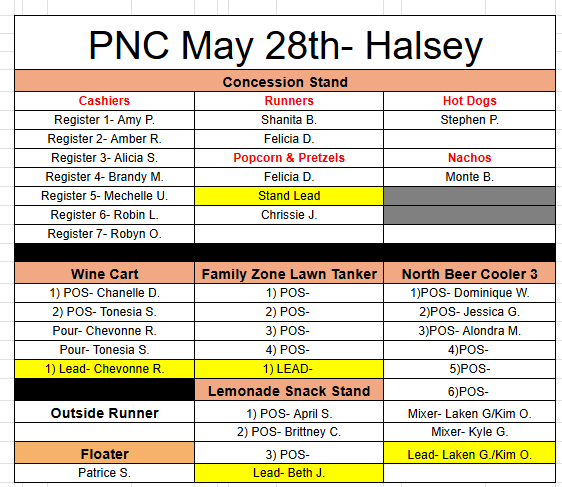 - From Lot F walk to the left towards Lot E. Walk down the steps and turn right. Walk straight across the street and follow the gravel lot to check in. Sign in on the CDYC clipboard and grab a red Live Nation shirt. Enter the gate and take the first left after the concession stand on your left and walk all the way to the north gate side. You will be directly in front of stand 1 which is the CDYC concession stand.
