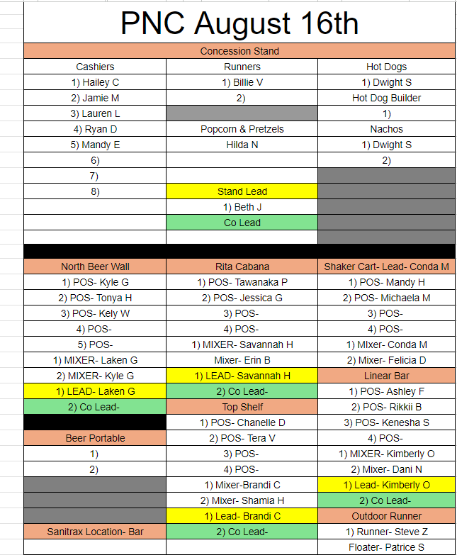 *Per PNC Live Nation would like for us to wear their shirts if you are working the outside bars. PLEASE make sure to get one at check in. If you are in the concessions stand please wear your red CDYC polo.
