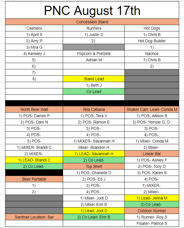 *Per PNC Live Nation would like for us to wear their shirts if you are working the outside bars. PLEASE make sure to get one at check in. If you are in the concessions stand please wear your red CDYC polo.
