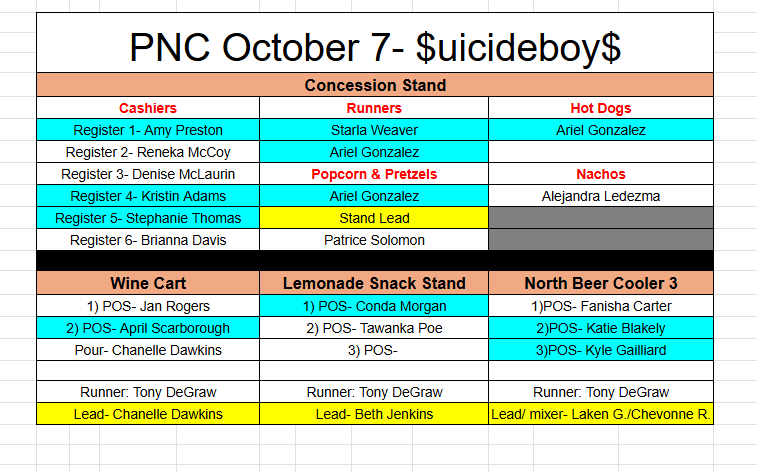 *Per PNC Live Nation would like for us to wear their shirts if you are working the outside bars. PLEASE make sure to get one at check in. If you are in the concessions stand please wear your red CDYC polo.